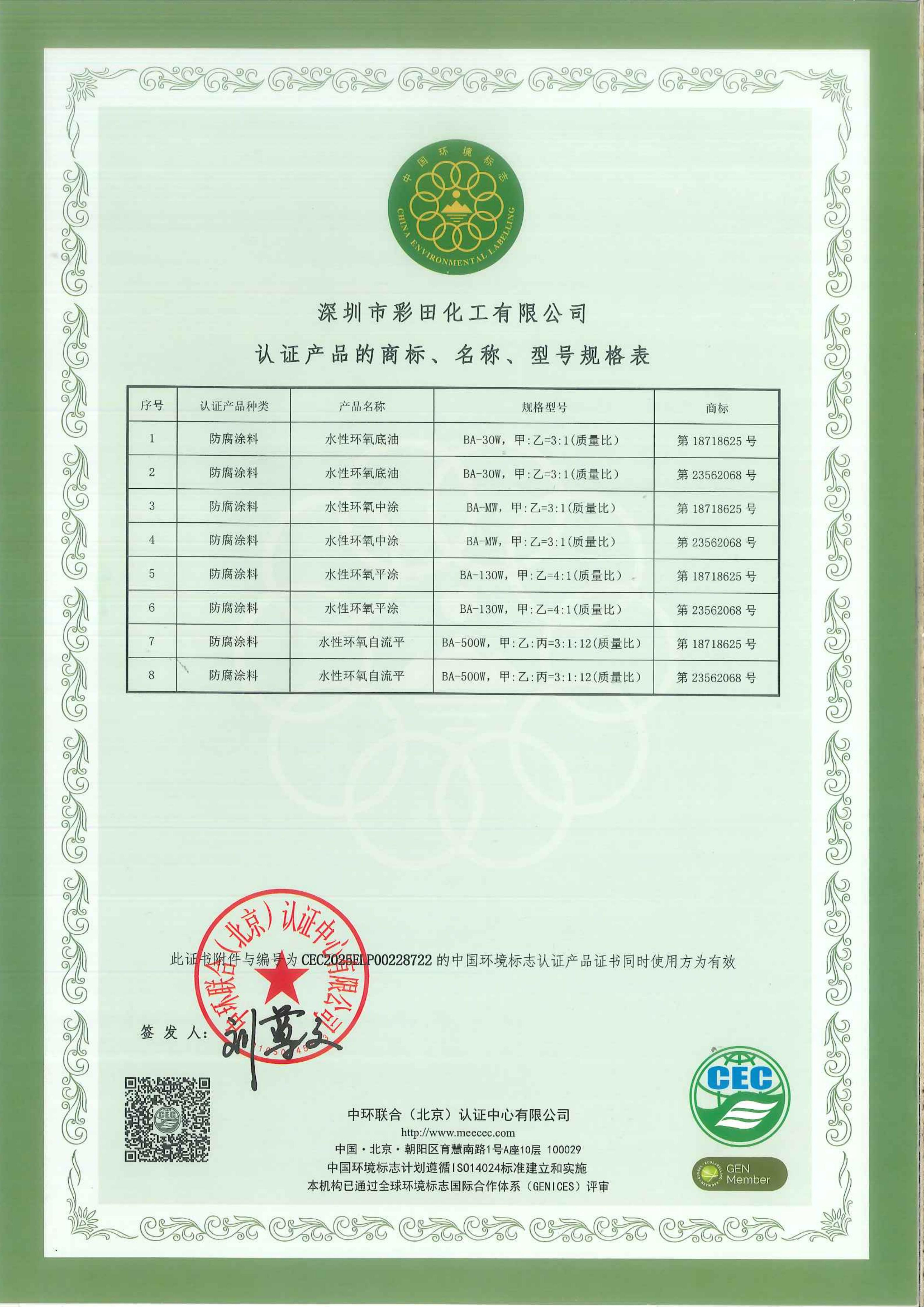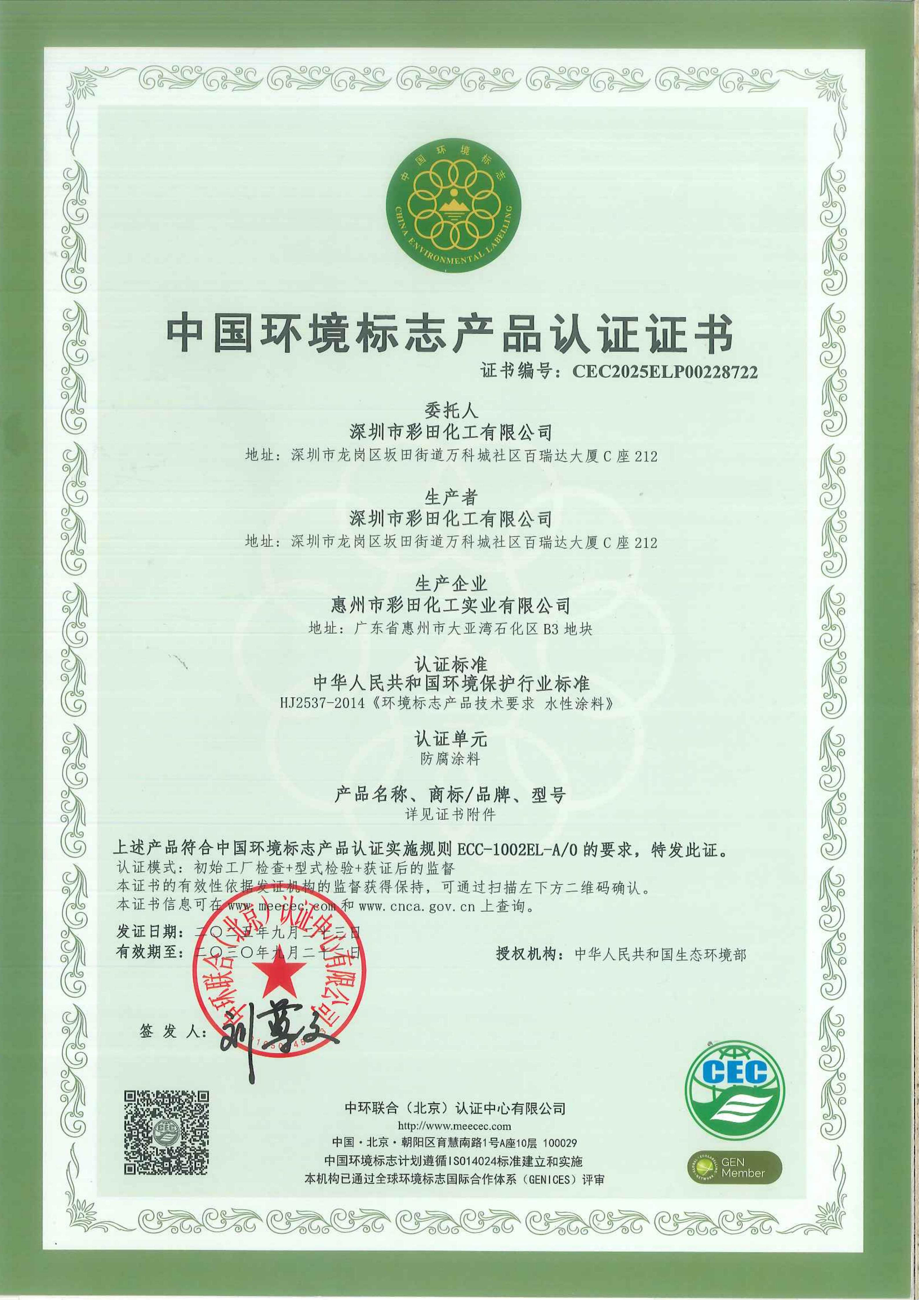 彩田化工成功通過中國環境標志產品認證(簡稱“十環認證”),標志著其在綠色生產和可持續發展領域邁向新高度。這一認證由國家生態環境部授權頒發,是國內最權威的環保產品認證體系之一,其嚴苛的審核標準和完善的評估流程體現了彩田化工在環境管理、資源節約及產品質量等方面的卓越表現。